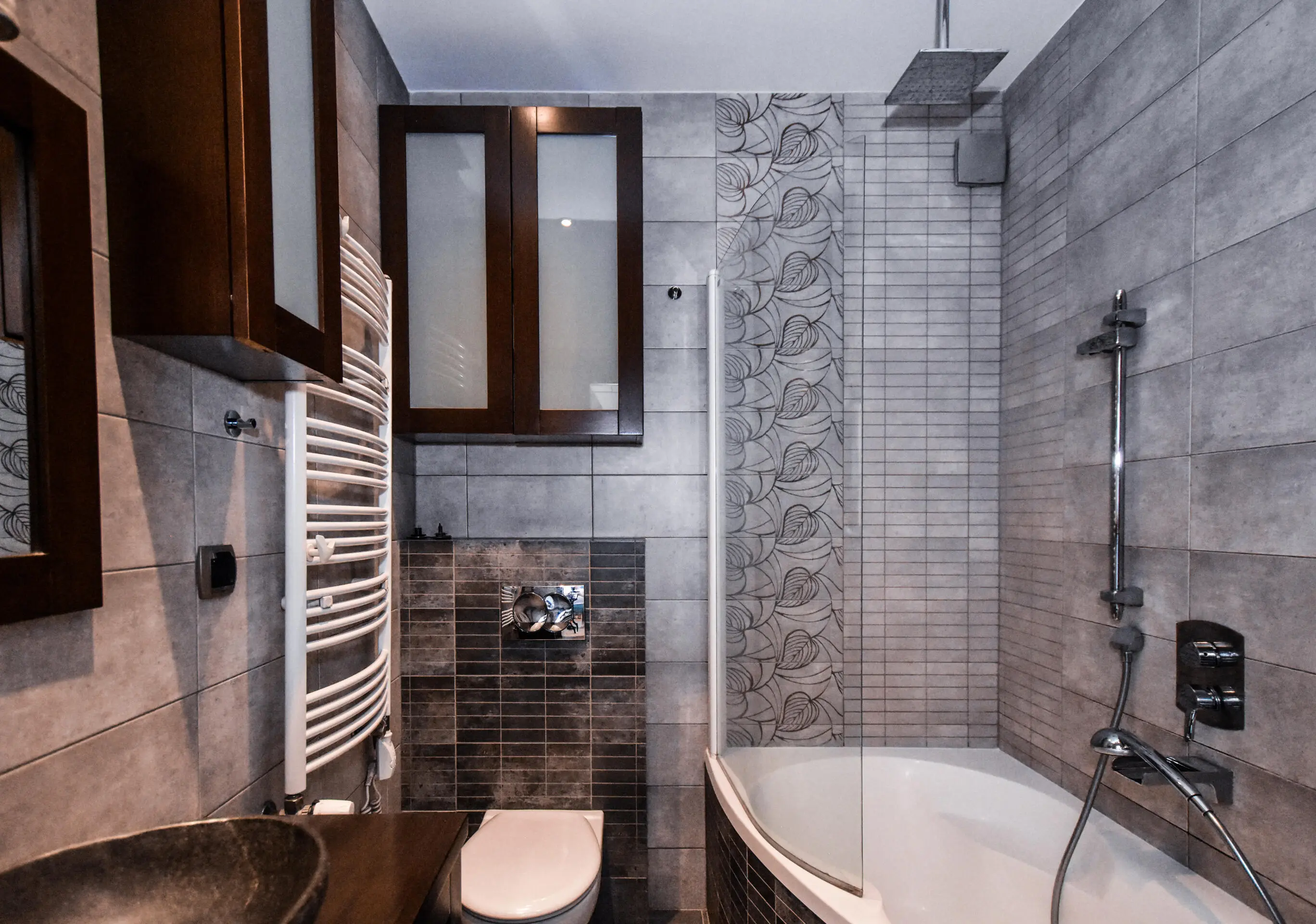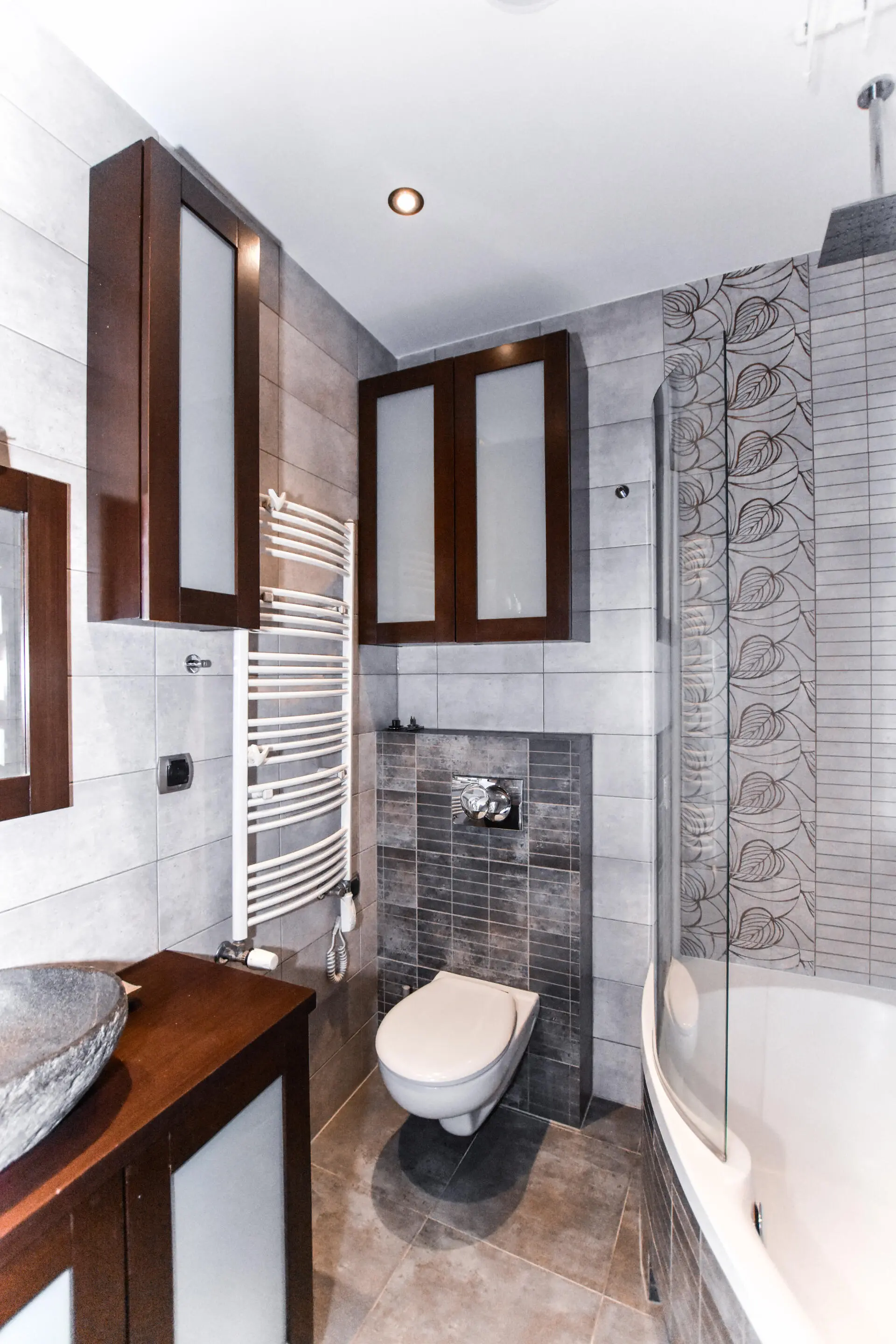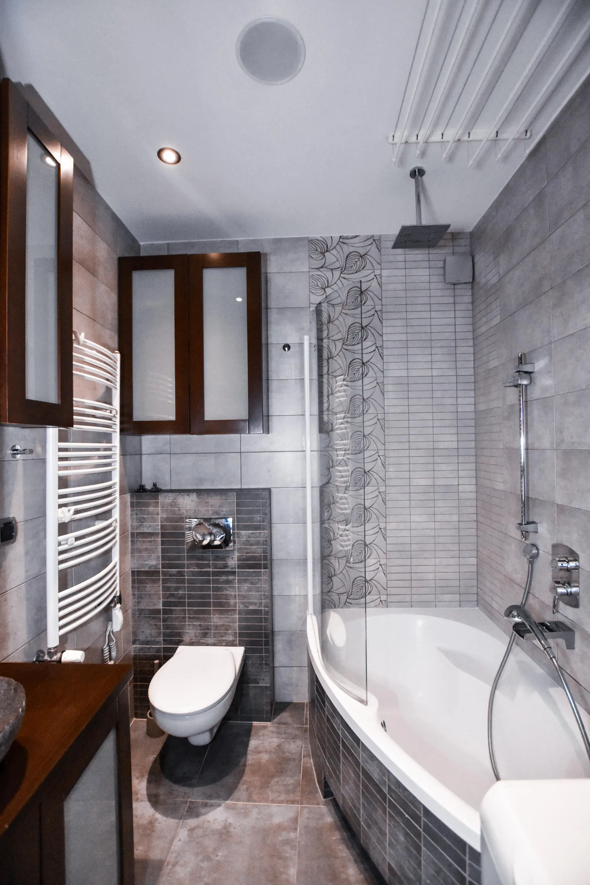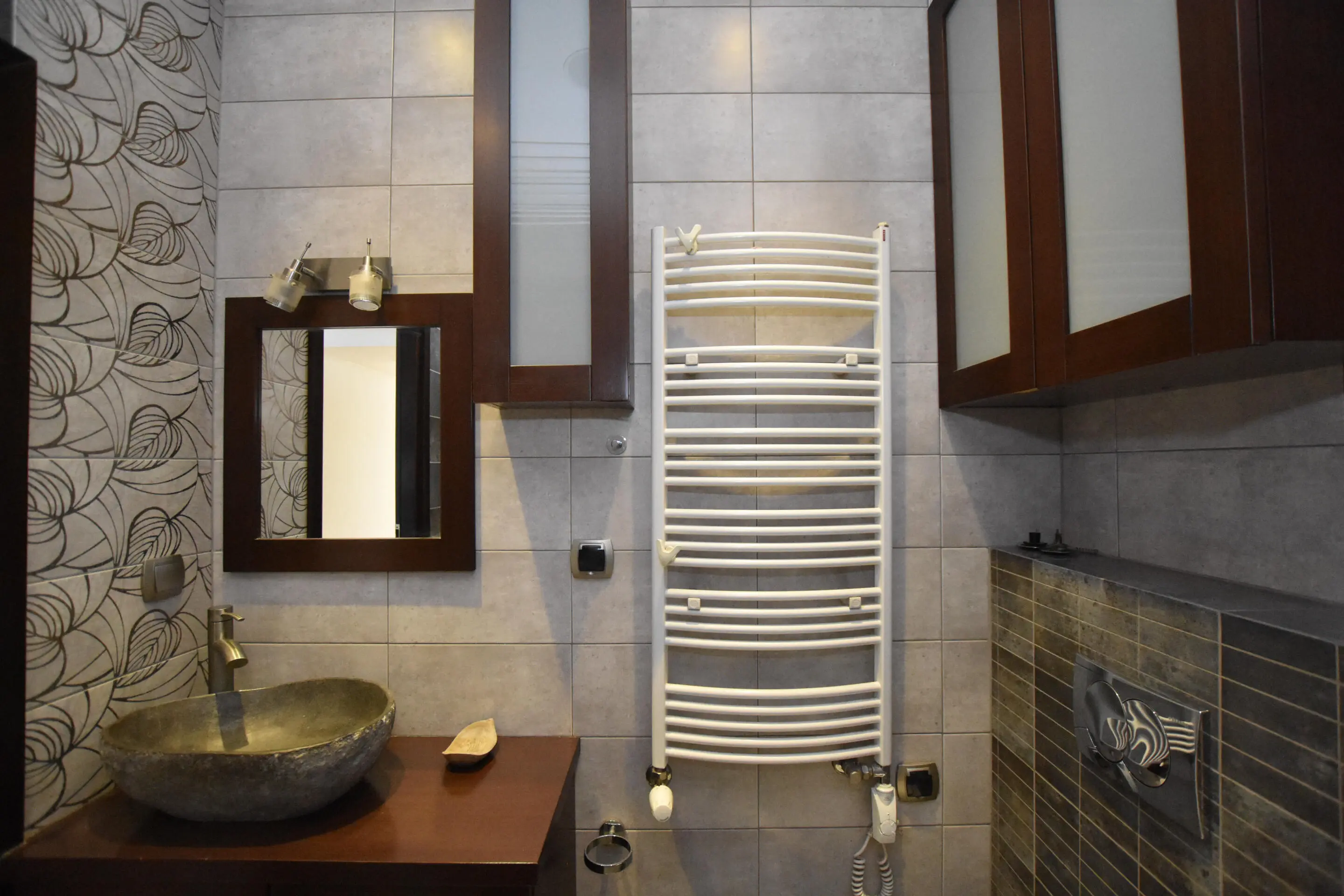 - Łazienka: duża wanna z szklanym parawanem umożliwiającym korzystanie z niej jak z kabiny prysznicowej, pralka, toaleta, umywalka z szafką.