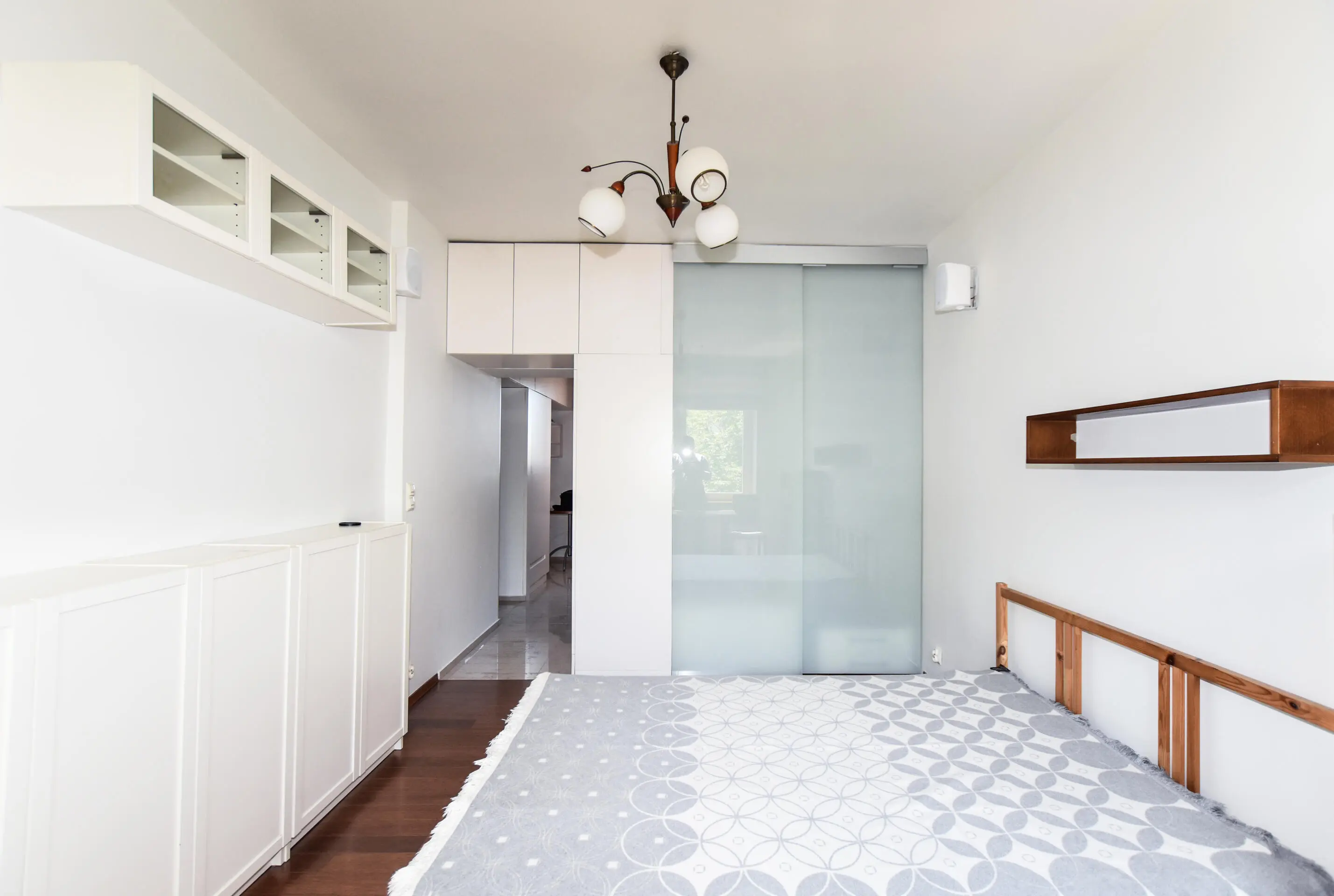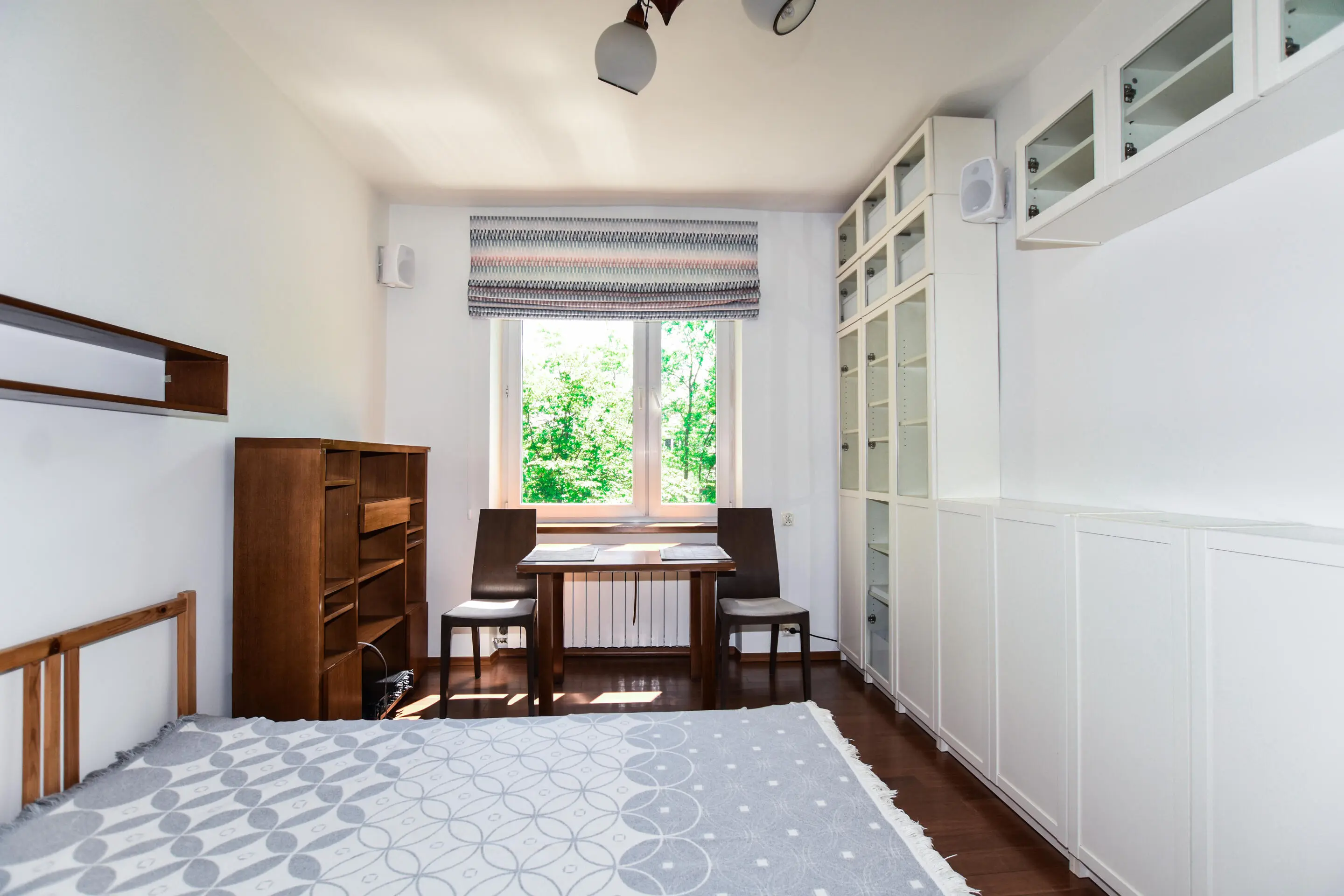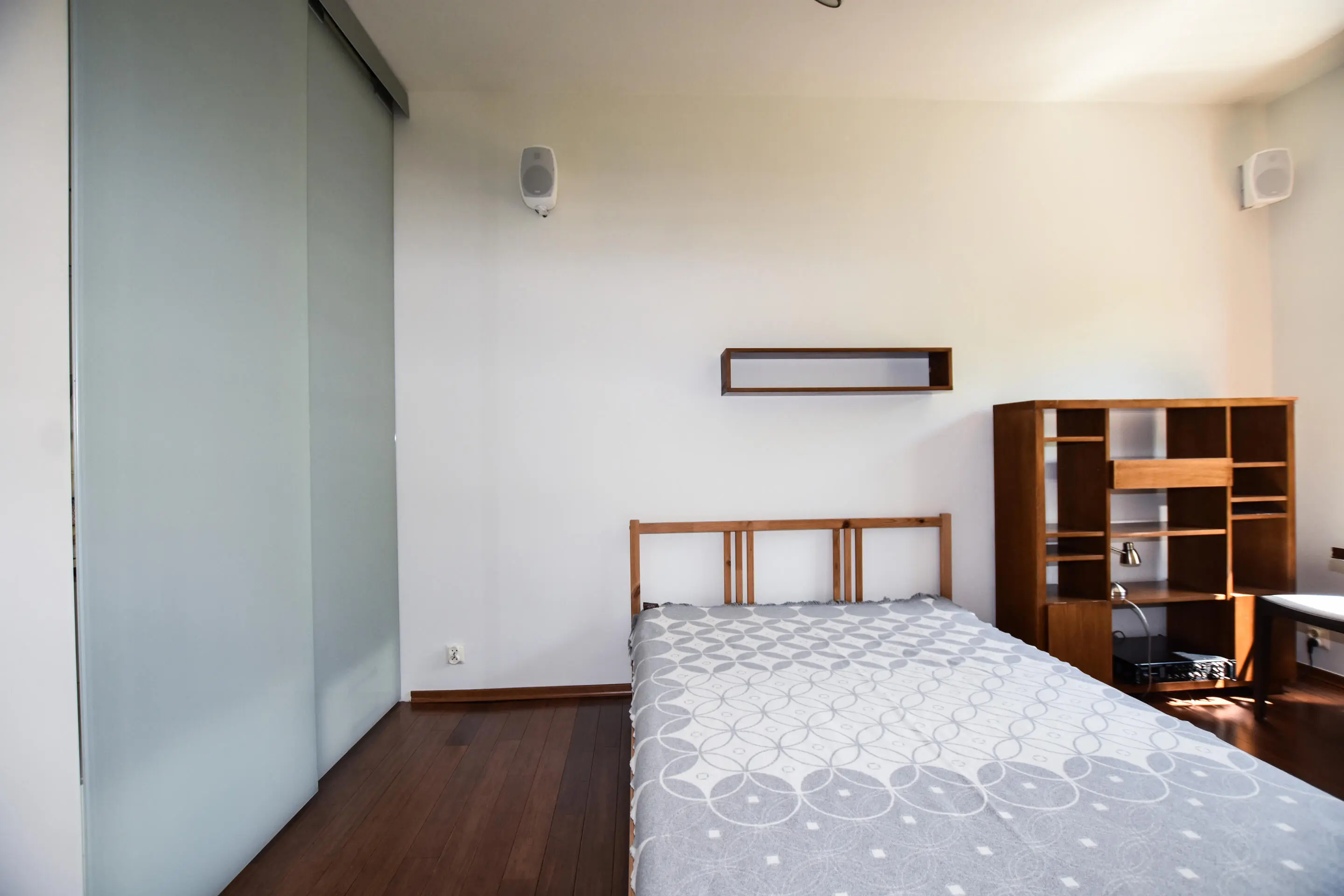 - pokój dzienny: duże łóżko dwuosobowe, szafa w zabudowie, duży stół z krzesłami, regał, zabudowa ścienna.