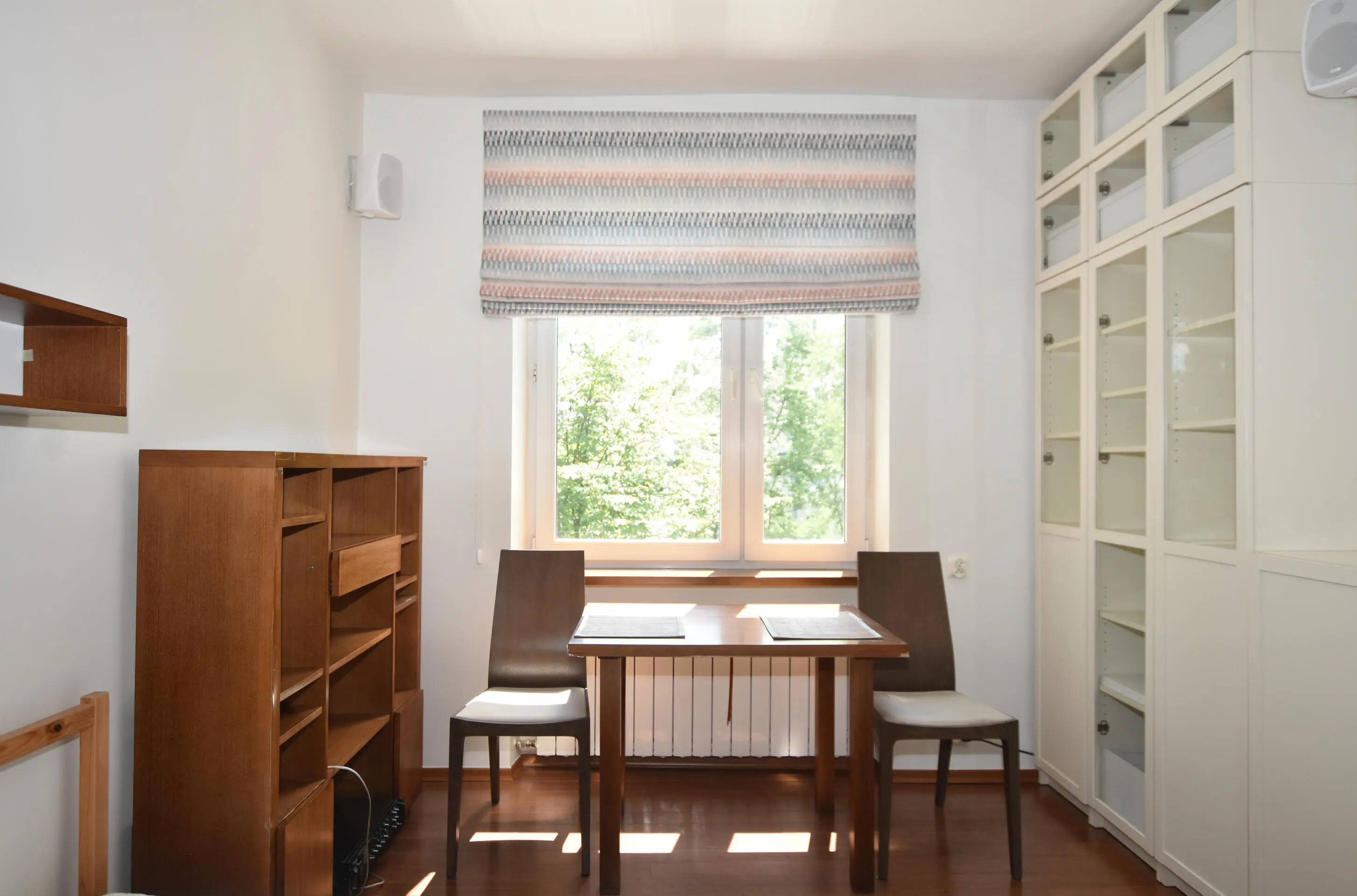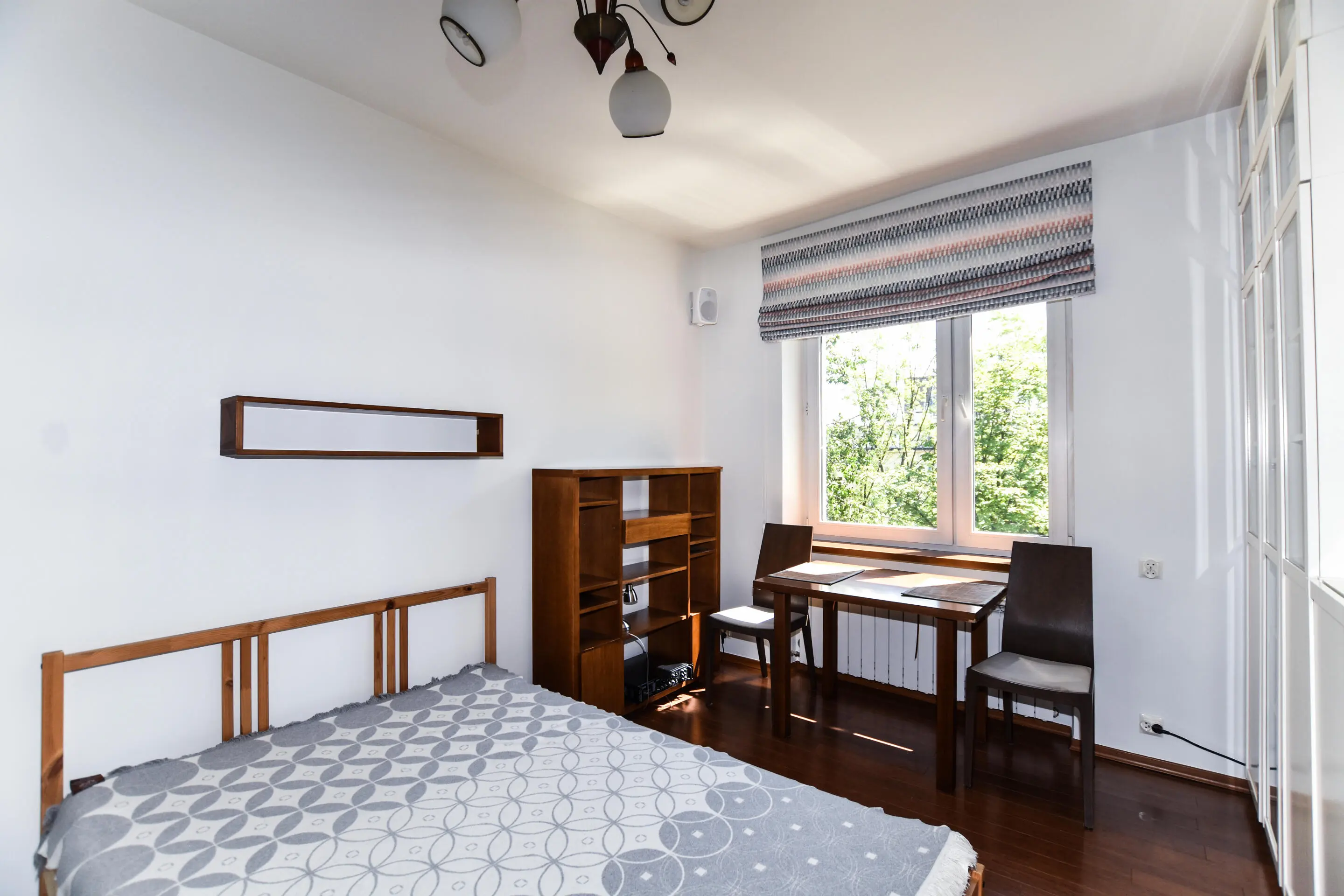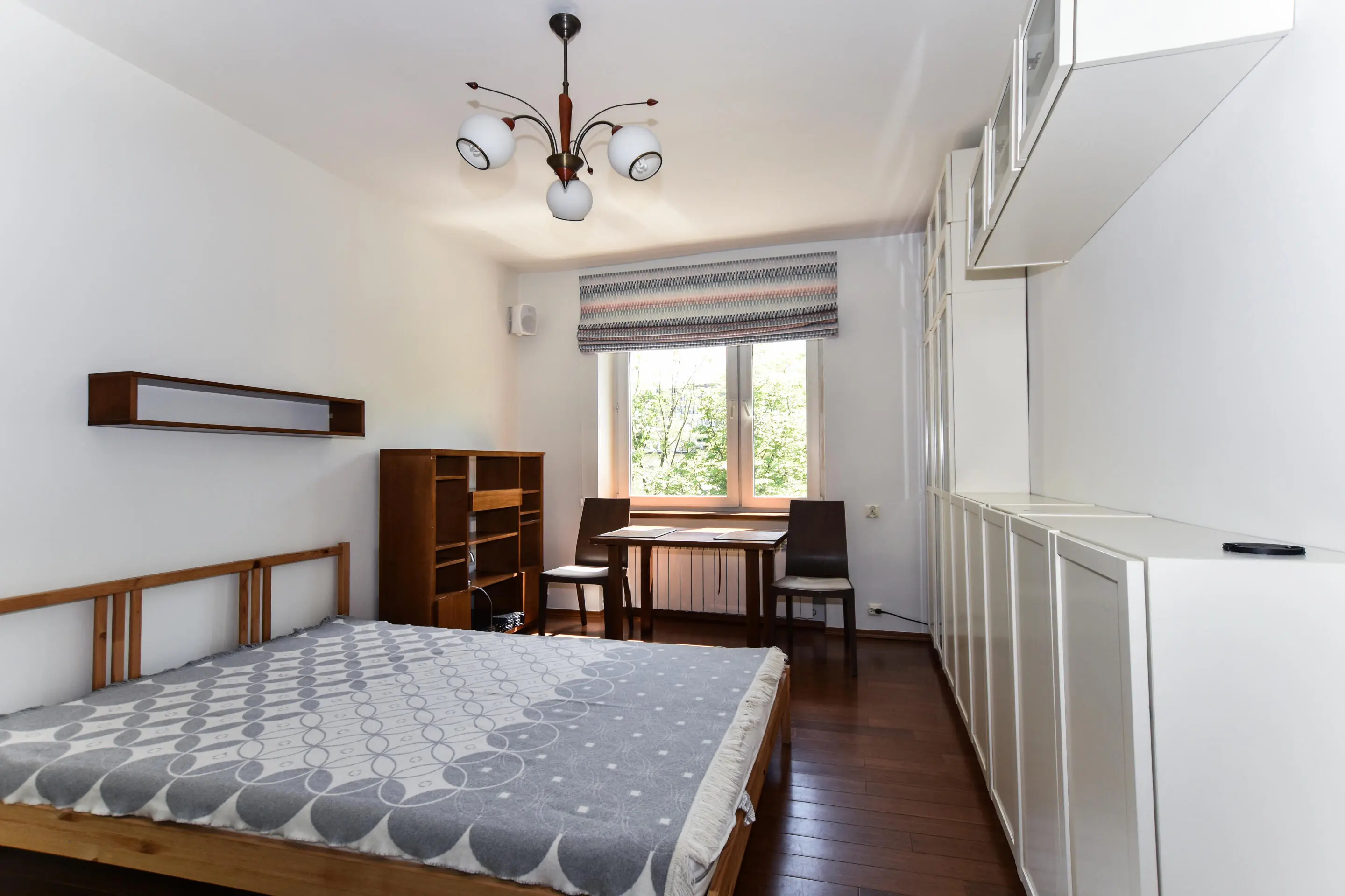 - pokój dzienny: duże łóżko dwuosobowe, szafa w zabudowie, duży stół z krzesłami, regał, zabudowa ścienna.